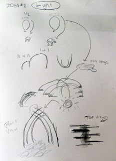 I created the bench with an indent so you can sit on three sides of the arch. I also gave the arch a drop shape to give the hallway more character. The second main idea I had was controlling the light. By drying plaster over a balloon an opaque effect is created where light can trickle through. The last main idea I had was adding a new material. I took corks and split them in half and poured plaster over them. The result was a porous half circle stone shape. I think they will go under the arches to create some sort of path. and sitting area.